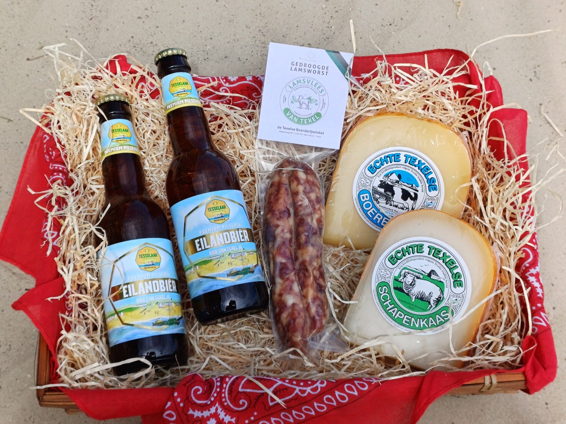 - Belegen koeienkaas van Wezenspyk- Belegen schapenkaas van Wezenspyk- Gedroogde lamsworst van eigen boerderij- 2x eilandbier (van Tesselaar) of grote fles appelsap (van Keyser)